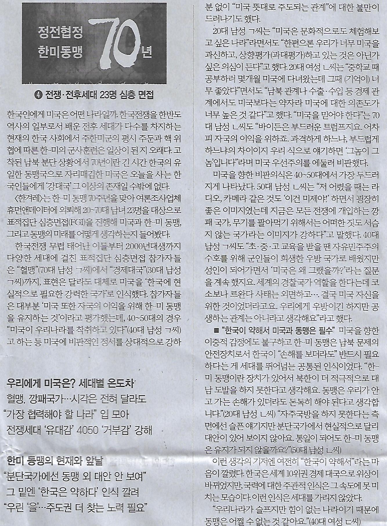35 한겨레 창간기획/ 정전협정 한미동맹 70년/ “한·미 동맹은 북 도발 억누를 안전장치, 반드시 필요”/ ❹ 전쟁·전후세대 23명 심층 면접(민중이 깨어나야 나라가 바로 선다)
