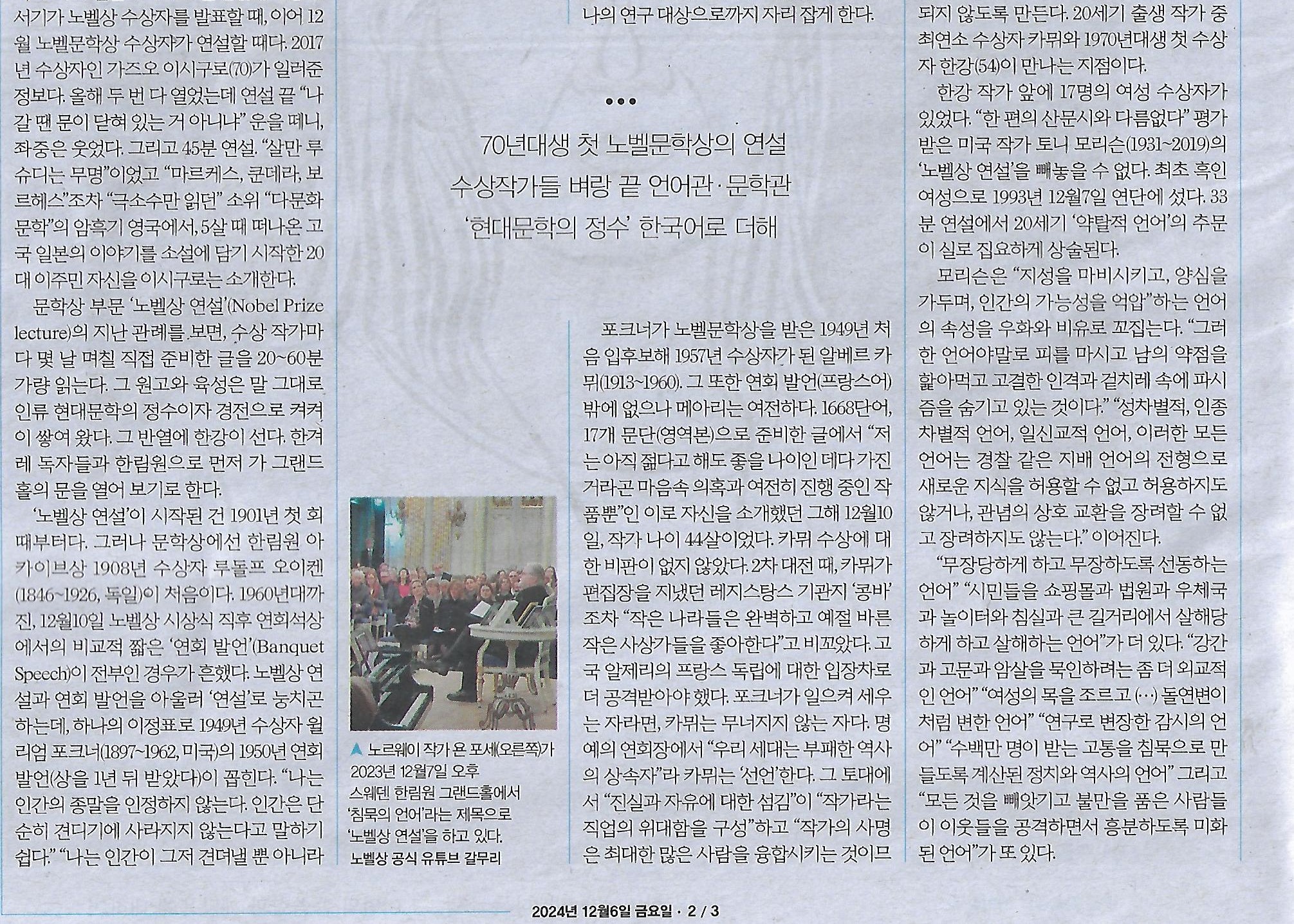 한겨레/ 2024년 12월6·7일 주말판/ .txt/ 세상의 모든 텍스트/ 커버스토리/ 노벨문학상 수상 작가 연설/ ‘왜 글을 쓰는가’ 내일 다시 한강의 시간(민중이 깨어나야 나라가 바로 선다)