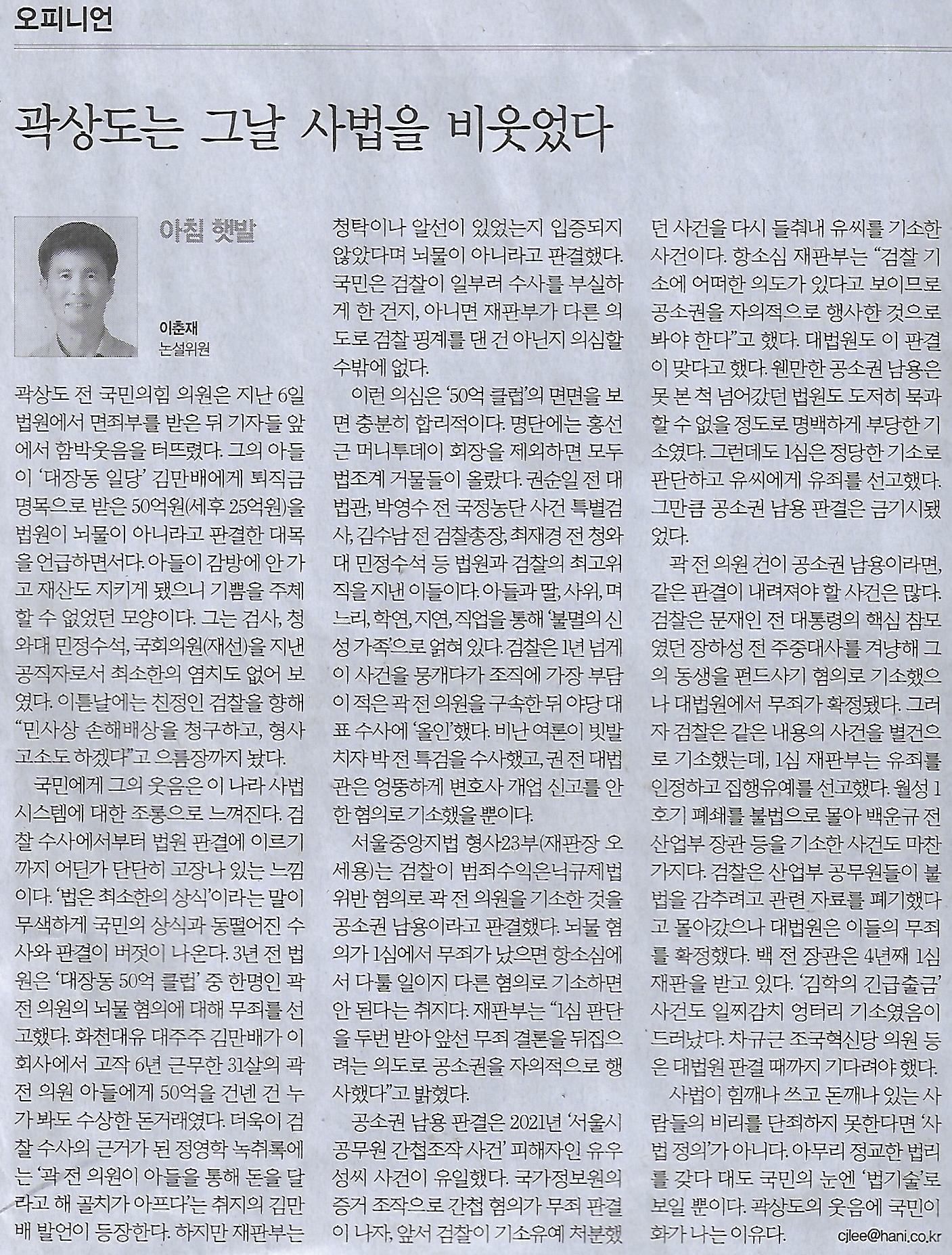 오피니언/ 곽상도는 그날 사법을 비웃었다/ 아침 햇발/ 이춘재 논설위원/ 러다이트 운동, 그땐 틀렸고 지금은 맞다/ 세상 읽기/ 최필수 세종대 중국통상학과 교수(민중이 깨어나야 나라가 바로 선다)
